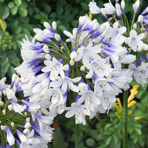 A magnificent and stately Agapanthus with unusual, bi-coloured blooms – a striking combination rarely seen in African lilies and definitely an eye-catching and unique variety. A plant that you really need for your garden, this recent introduction from Europe has been met enthusiastically by everyone who sees it, and it's easy to see why. The good-sized clusters of flowers open from white buds, developing into gorgeous trumpets with rich blue bases and white flaring tips to the petals – they look just like a firework display going off in your flower beds and pots. The flowers emerge on top of robust stems from the luxurious, sword-like leaves and put on a great show from mid to late summer and they're great for cutting – plus the dried seed heads can be sprayed and brought into your home over winter. Relatively compact for an agapanthus, 'Twister' looks fabulous in a pot on your decking, patio or balcony, so is ideal for people with little space – if you only have room for one plant then this is a definite contender for your attention! Although this variety is half-hardy, it does not like cold wet weather, so we recommend covering with a thick layer of dry mulch in winter if planted out, or if kept in a pot, moved into a dry, frost-free area if the temperature drops below -5. Supplied as 3 x established plants in 9cm pots, ready to plant out.