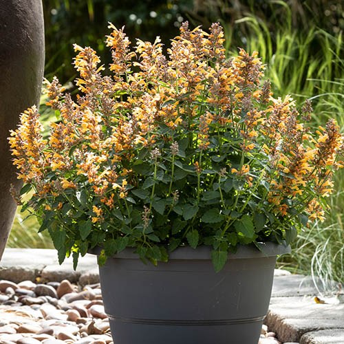 Agastache is an upright, bushy hardy perennial with a long flowering season that blooms in spikes that rise from the foliage on stiff triangular stems. The aromatic foliage is mid-green and serrated with heavy veining, resembling catmint. Agastache is a member of the mint family, and the leaves can be used to make tea. Although many varieties of Agastache flower in shades of blue and lavender, 'Apadana Orange' bears clusters of golden orange tubular florets that completely cover the top 10cm its flower spires and open from the top downwards between May and September. Recommended by the RHS as a 'Plant for Pollinators', they are a favourite with butterflies and bees and other beneficial insects, and they make great cut flowers too! Preferring dry conditions, Agastache loves to grow in full sun and poor, well drained soil that's moderately fertile, so it's happy growing in dry conditions such as gravel gardens and coastal locations. It looks fantastic in a patio pot, perfect if you have heavy, rich soil. It is also very hardy and requires no additional feeding. Supplied as an established plant in a 9cm pot, ready to plant. Reaching a height of 50cm (20in) and spread of 35cm (14in).