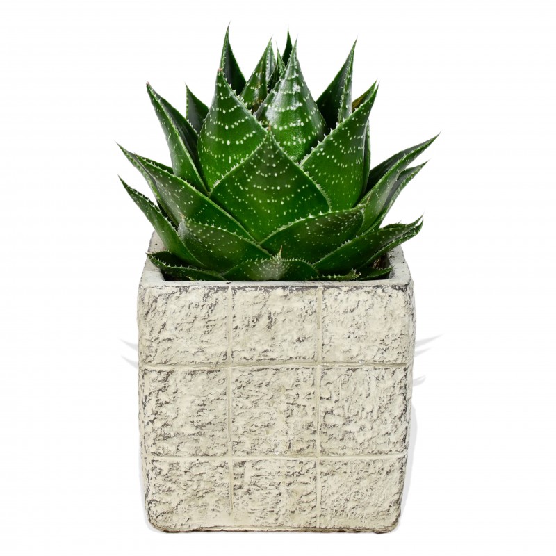 Aloe Cosmo is a stout, bright green variety of succulent. It has rich green fleshy leaves in a dense rosette with fine white spots running along the leaves. Ideal in any succulent garden, or suitable in pots, this plant tolerates wide range of positions, provided the soil drains freely. Light and Water A small companion to any desk or shelf, which likes any bright indirect sunlight. Place a few around your home to help green up your spaces as well as pull any toxins form the air. Lives best in dry environments and you should allow the soil to dry thoroughly before watering fully as it does not do well standing in water.