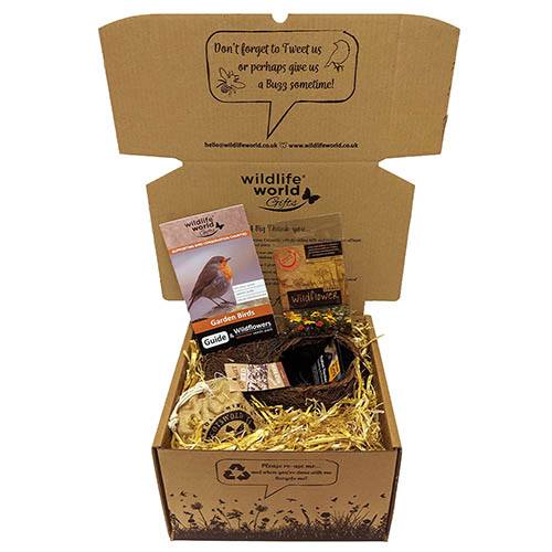 This Bird Themed Gift Pack contains a selection of products that will help you attract a range of birds to your garden. Inside, nestled in a bed of fully compostable barley straw, is an award-winning robin nester (H13 x W25 x D14cm), designed by wildlife expert Simon King. Constructed of brushwood over a durable metal frame, it is ideal for hanging by a garden shed or wall, or in natural cover such as hedges. Not only is it suitable for robins, but it will also attract other species of small birds such as finches, dunnocks or wrens who may be looking for a safe and snug place to nest. Also included is a pack of gourmet bird food in a plastic-free hessian bag and innovative compostable inner liner. In addition, we have provided a bird species guide and some native wildflower seeds, which will add gorgeous diversity and cover for wildlife to your garden. The gift pack makes a perfect present for garden bird lovers – or a treat for yourself to help you make your own garden more wildlife friendly.