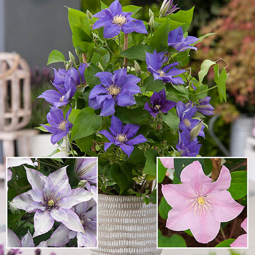 It's incredible but true… these compact beauties really will produce a tower of striking star-shapes blooms continuously for 6 months – every year. The BOULEVARD(R) series of patio clematis has been bred specifically for a compact growing habit and a precocious flowering nature. This specially selected collection will captivate all summer long with large, blousy blooms and repeat-flowering. They are perfect for growing in small spaces, in pots and containers, so are ideal for modern gardens where space may be limited. The plants will never get out of hand and reach a mature height of around 1-1.5m (3-5ft), and as they flower all along the stem from the leaf axils, these splendid clematis are covered in blooms right from top to toe! In this collection you will receive: 1 x Clematis Patio 'Pompeii' Boulevard – Delightful pastel pink flowers that bloom from the ground upwards, they appear in the spring and last until late autumn, providing you with an incredibly long and beautilful flowering season. 1 x Clematis Patio 'Olympia' Boulevard – This compact clematis blooms all the way along its stems, resulting in a proliferation of large, rich purple-blue flowers from the ground upwards all summer and into late autumn. Makes a beautiful feature of fences, trellises, and arches and is especially effective in containers. 1 x Clematis Patio 'Samaritan Jo' Boulevard – With pretty silvery-pink star-shaped flowers outlined with a delicate tracery of light purple, the blooms are further accentuated with a beautiful crown of purple stamens topped with the clearest golden yellow – a real sight to behold. These gorgeous clematis are robust, hardy and easy to grow with vigorous re-growth every spring. They will only require a small amount of annual maintenance. Just cut all the stems back to 15cm (6in) in February – March. Supplied as a collection of 3 x established plants in 10.5cm pots, ready for planting.