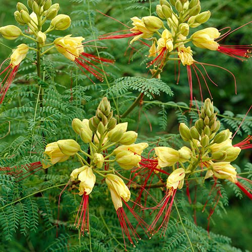 If you want to grow something different, then this is the plant for you! The Yellow Bird of Paradise (Caesalpinia gillesii), is a bushy shrub with a profusion of snapdragon-like flowers dripping with orange-red tassels. Caesalpinia goes by several other names, including the Desert Bird of Paradise and Crimson Threadflower – which give a hint to its drought tolerance and beautiful flowers. The yellow flowers reach around 2.5cm (1in) and are extended further, sometimes by as much as 7.5cm (3in), by the showy stamens which are produced on erect stems 15-30 (6-12in) long. The blooms are a favourite with humming birds in its native South America. Rarely sold or grown in the UK, Martin discovered it on a Spanish Nursery on a trip there recently, and bought all we were allowed to. With fine feathery foliage, like an Acacia, this bird of paradise (which incidentally is not related to the Strelitzia), is borderline hardy in the UK, so we advise protecting from frost in winter. Grow it in large pots in a sunny position, and enjoy its amazing flower displays in late summer. Caesaplinia easy to care for and generally problem free – plants under glass may need a restrictive prune after the first flush of flowers.
