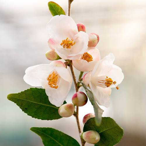 New to our range of shrubs for 2018, be one of the first to have this fabulous Camelia in your garden next spring! Be the envy of your gardening neighbours and welcome in the gardening year with this unusual Camelia, with pink buds forming along the slender branches and then opening to reveal perfectly formed, small white flowers, flushed with pink on the outer edges. To add to the stunning show, new shoots are red when they first emerge, creating a fiery burst of spring colour. Camellia rosthorniana Cupido® is a compact, evergreen shrub with an upright pyramidal growth, making it an excellent specimen for a container on your patio or in your flower border, providing structure and colour throughout the year. This means that you can enjoy the colour spectacle not only from your garden, but also from a patio or balcony. A definite sight to behold, 'Cupido' provides year-round garden interest, with its pastel flowers, flaming shoots and glossy leaves. Camellia rosthorniana Cupido® is an award-winning plant – winner of a Bronze Medal Plantarium 2012 – and performs best in partial shade in moist, well-drained soil. Suppled as an established plant in a 13cm pot, ready for planting out.