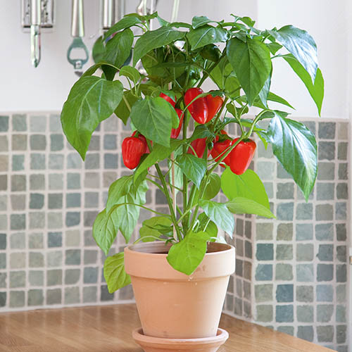 An amazing twist on the traditional sweet pepper 'Snack Red' will produce delicious snack sized peppers that are wonderfully sweet and crunchy and can be eaten straight from the plant! The peppers are green initially, before ripening to a gorgeous, glossy rich red colour and they have thick walls which gives them a wonderfully firm crunch when eaten fresh. They're also ideal in salads and for stuffing and grilling, and a great source of vitamins A and C as well as potassium and iron – a perfect, healthy snack. A versatile plant, it can be grown on the patio or in the vegetable garden or greenhouse, and it makes a spectacular looking houseplant in a sunny, warm spot. Position it in full sun to get the biggest, sweetest crops of scrumptious miniature peppers, producing flowers and fruit month after month. Supplied as an established plant in a 9cm pot, ready for planting after the risk of frost has passed, reaching 90cm (3½ft) tall.