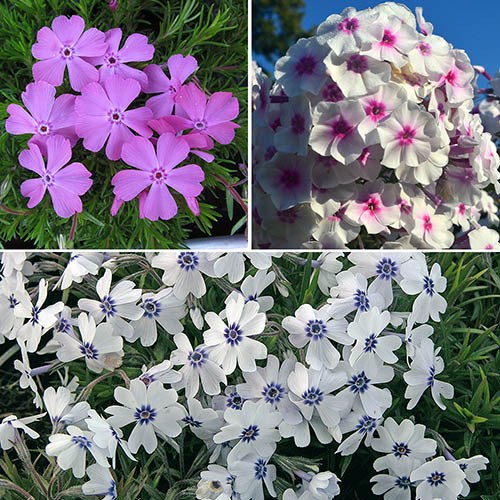 Creeping phloxes are dainty, colourful evergreen perennials that create wonderful blankets of spring colour during April and May and are just the thing for dotting around borders and make excellent groundcover for keeping weeds at bay. Completely covered in masses of star-like flowers along with attractive needle-like foliage, each plant will spread to 60cm (2ft) across and is the perfect choice for rock gardens and for edging paths and borders. Also known as creeping moss phlox, you can grow it in mixed borders in full sun as well as in all manner of containers – such versatile plants and a spectacular sight in full flower! As well as making an invaluable groundcover plant, carpet phlox is virtually maintenance free and hardy, needing very little in the way of aftercare, and they're attractive to pollinating insects too, providing a valuable source of early nectar! Supplied as 6 established plants in 9cm pots, growing to 15cm (6in) tall and spreading 60cm (2ft), 2 of each variety including: 'Pharaoh Red' – Pure white flowers with pinkish-red eyes.'Pharaoh Blue' – Blue eyed, white flowers.'McDaniels Cushion' – Bright, rich pink flowers, and holder of the RHS Award of Garden Merit