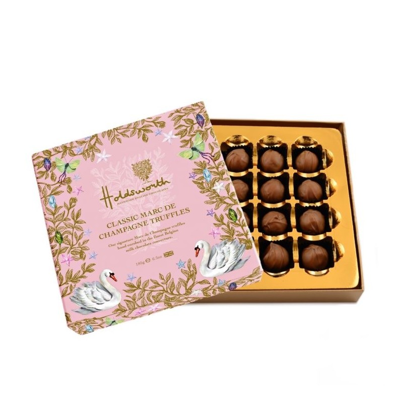 Signature Marc de Champagne truffles, enrobed in the finest Belgian Milk Chocolate.Presented in a pink swan gift sleeve, this stunning box is the ideal gift.Ingredients: Milk Chocolate 59% (Sugar, Cocoa Butter, Whole Milk Powder, Cocoa Mass, Emulsifier: Soya Lecithin, Natural Vanilla), Dark Chocolate (Cocoa Mass, Sugar, Cocoa Butter, Emulsifier: Soya Lecithin, Natural Vanilla), Butter (Milk), Fondant (Sugar, Glucose (Wheat), Water, Preservative: Sulphur Dioxide), Alcohol (Marc de Champagne 4%).For allergens, including cereals containing gluten, see ingredients in bold. May contain nuts and peanuts.