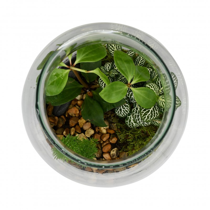 A great gift idea, this classic terrarium is created using activated charcoal, specialist soil and moss. It features a number of miniature plants including fittonia, peperomia and spiderwort. Enjoy yours today.