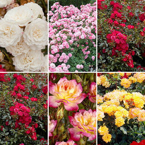 These are a great little collection to fill those awkward spots most gardens have. Tolerating quite a bit of shade (or full sun), as well as most types of soils, these fab new little groundcover roses really are so versatile and easy to grow. From the newest of breeding, they are classified as 'Multiflora', meaning they produce hundreds of smaller flowers in summer and autumn, filling up gaps in beds and borders with a floriferous display. Tried and tested in commercial landscape plantings where they get almost no maintenance or help, they form neat mounds of flowers, and have good disease resistance, so really are easy care. One trim back hard each spring before they start growing really is all they need, plus a couple of feeds a year. Simple! In this mega deal, you will get: 1 x Rose 'Teeny Weeny Pink' – Small mid pink flowers, with darker edge on cool nights. 1 x Rose 'Teeny Weeny White' – Sister of 'Teeny Weeny Pink', white flowers that have pink tinged edges. 2 x Rose 'Perle d'Alcanade' - A gorgeous deep cerise red rose. 1 x Rose 'Giulietta' – Lovely pale primrose yellow. 1 x Rose 'Baby Masquerade' – Lovely peach melba two tone flowers. Supplied as 6 x established plants in 9cm pots, Ready to be planted out any week of the year you can get a spade in the ground!
