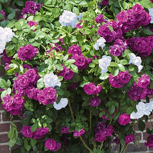 A gorgeous combination of 2 rose varieties, Rose 'Indigoletta' has a classic violet bloom and this harmonises perfectly with the pure white of Rose 'Climbing Snow'. Flowering until late autumn, this classic combination of two colours will fill your garden with rose blooms and give you a defininte talking point! 'Indigoletta' opens deep-purple and gradually lightens in shade as they age meaning each and every flower is completely different in colour, creating a real rainbow of shades.'Climbing Snow' is a climbing rose that's smothered with bright white flowers from early summer to late autumn. Supplied as a single grafted bare root plant with both colours, violet and white.