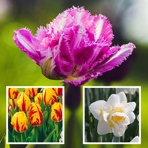 This 'Dutch Master' Collection is a selection of magnificent tulips and daffodils is bright, contrasting colours that will shout out for attention. Vibrant yellow and red clash spectacularly with deep purple tulips, whilst the gentle cream and yellow of the narcissus brings a little calm. A bold colour combination that will definitely brighten up your spring planting. Tulip 'Washington' is a Triumph tulip, a cross between two exceptional varieties, Single Early and Darwin, creating an extremely robust tulip with superb weather resistance. The large, cup shaped flowers are bright golden yellow with rich scarlet streaks. You'll receive 10 bulbs, size 10/11, growing to a height of 45 cm (18 in) and spread of 15 cm (6 in). Tulip 'Purple Crystal' is a stunning fringed tulip with wonderfully rich burgundy purple flowers that have a darker purple frill around the edge of each petal, giving it a superb texture. You'll receive 10 bulbs, size 10/11, growing to a height of 40 cm (16 in) and spread of 15 cm (6 in). Narcissus 'White Lion' a holder of an RHS Award of Garden Merit, this daffodil has gorgeous double flowers with alternating layers of cream and pale yellow petals and a deliciously sweet fragrance. You will receive 10 bulbs, size 12/14, reaching a height of 40 cm (16 in) and spread of 15 cm (6 in). Easy to grow in sun or partial shade, in borders or large pots with free-draining soil, plant them in autumn to flower in spring. They will give you a superb display which will get better every year as they begin to naturalise and spread. If you prefer, the tulips can be dug up and stored over winter.