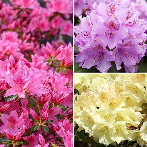 A collection of three stunning Rhododendrons to give you vibrant blooms in spring and year-round, evergreen foliage interest. Contrasting with the gorgeous flowers, the evergreen leaves are glossy green and provide a good foil for other plants such as colourful perennials – which will also give another layer of planting to your garden. Growing to around 100cm (3ft 3in) high and wide, depending on variety, Rhododendrons are ideally suited to container growing, and this will also help to keep them compact and of course easy to maintain. Perfect for providing masses of colour in early spring, Rhododendrons thrive in moist soil and partial shade, and need acidic soil, so incorporate plenty of ericaceous compost to the planting hole or container when planting. Supplied as a collection of 3 plants in 2L pots, 1 each of Yellow, Purple and Pink.