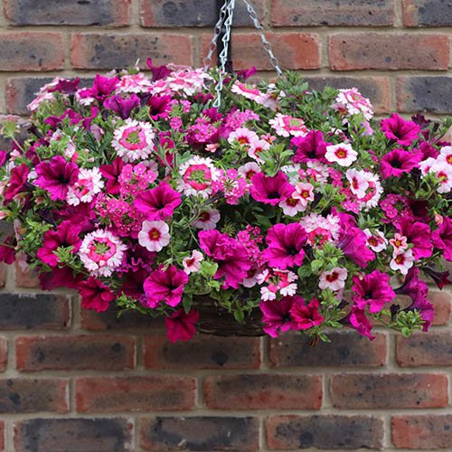 Quick and easy, our pre-planted hanging baskets are the perfect solution for gardeners who want perfect displays but don't know where to start. We've hand-picked the best plants for you, carefully choosing varieties of Petunia, Calibrachoa and Verbena which blend together in harmony to create fabulous displays. Guaranteed to give you fabulous results, we've done all the work for you – just hang them up, water them and let them do their thing. Consistent and predictable results every time. Pre-planted, just waiting to cascade with colour. Giving you superb colour in your garden throughout summer our ready-made baskets are the result of extensive trialling to find the perfect partners to grow together and perform consistently – plus you'll have the baskets to use again next year! Producing endless waves of simply gorgeous flowers in shades of pink and purple, our hanging baskets come ready planted with our top quality, UK-grown plants with no work required! Supplied as a pair of ready-planted green baskets for immediate display featuring: 1 x Petunia 'Pegasus Purple' - luxurious trumpet shaped magenta blooms. 2 x Calibrachoa 'Calita Pink' – masses of dainty pale pink flowers flushed with raspberry in the centre and a yellow eye. 1 x Verbena 'Vectura Rose' – clusters of beautiful pink blooms. 1 x Verbena 'Samira Red Wing' clusters of two-tone red flowers.