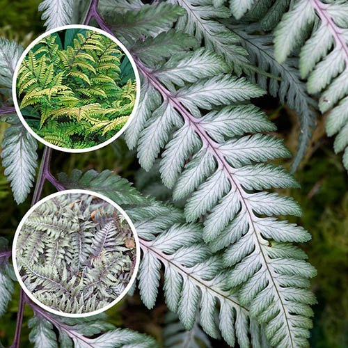 Hardy ferns are a hidden gem of the gardening world and should be grown much more widely. Graceful and airy, with a whole range of colours, textures and sizes available, there is a fern for every garden and every gardener! We've hand-picked a select trio of ferns which we think are really special – they're all hardy and will stand out in your garden with their unique leaf colouring. Some of the best to grow, these ferns will reward you with colourful foliage interest, and are perfect together as a small fernery in the border or in a large pot, or even in mixed planters. They all prefer cool, fertile soil that doesn't dry out and are best in light shade where their colours really shine. In this collection: Athyrium niponicum 'Pewter Lace': This perennial Japanese Painted Fern will certainly bring something a bit unique to you beds and borders. With its metallic 'pewter' grey fronds, edged with mint-green and burgundy veins, it almost looks like a piece of art. H50cm (19.6in) x W50cm (19.6in). Athyrium niponicum var. pictum 'Ursula's Red': The painted lady fern, the newly emerged fronds of this beautiful fern have rich purple-bronze tones. This two-tone effect fades as the fronds mature – the purple tones diminish, and they become greener with a silver dusting. Striking in a large pot and placed on a shady terrace. H40cm x W120cm. Athyrium otophorum var. okanum (AGM): Yellow green, glowing foliage with contrasting red veins and stipe. Very good in a pot and prefers shade. A deciduous fern, so leaves die back in the winter before emerging again next spring. H45cm (18in). Supplied as 3 x established plants in 9cm pots, ready to plant out.