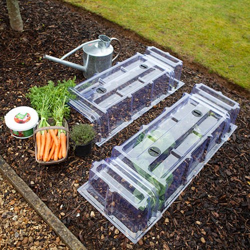 The perfect way to start off your young plants outdoors, this cloche will give them all the protection they'll need from the elements as well as from birds, cats, flying insects and other pests. Use it to grow seedlings, or keep it in place to protect salad crops or strawberries. Thanks to their clever design, they provide the perfect growing environment for your tender young plants. Rainwater is collected in the built-in reservoir to help stop plants from drying out between waterings and the crystal clear plastic lets in the maximum amount of sunshine and warmth, with two adjustable vents helping to control air flow and temperature. When the ends are fitted, the cloche becomes entirely enclosed, guarding against all manner of pests. Made from clear plastic and supplied with 12 securing stakes, they can be extended by joining them together with additional cloches. Main cloche size: W40cm (16in) L86cm (3ft) H22cm (9in). Cloche ends: W41cm (16in) L21.5cm (8.5in) H22cm (9in).