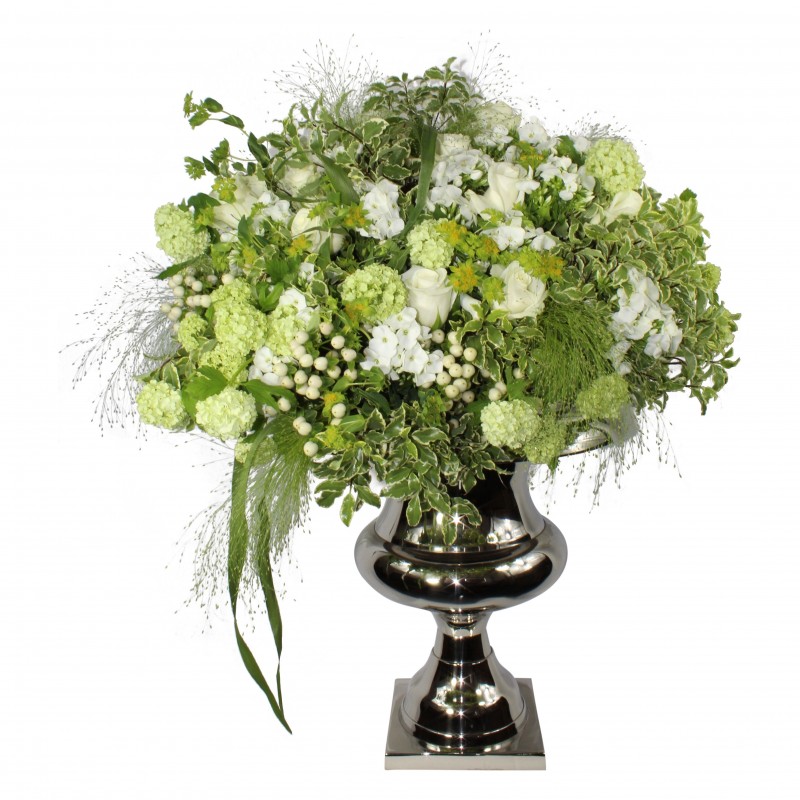 It might be because we’re biased, but we love this arrangement. Luxurious and loud, it’s eye catching quality is undeniable, with white roses, viburnum, hypericum and pittosporum supported by towing fountain grass and the delicate petals of phlox.