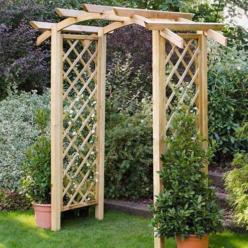 The Genoa Arch has an elegant curved top, with its extra height and width it will create a stunning garden or walk-way entrance. The lattice side panels are the perfect place to grow climbing plants such as wisteria to create a colourful, sweet-smelling focal point in your garden. This high quality structure has been manufactured using smooth-planed Pressure Treated timber which carries a 15 year guarantee to protect against rot and fungal decay. For an easy assembly, the rafters are notched and the arch is supplied with comprehensive instructions. The high quality Genoa Arch is a substantial structure, making a stunning entrance to a garden Manufactured from smooth-planed, Pressure Treated timber for a superior build Traditional roof batons aid a sturdy structure and have a slight arc for an aesthetically pleasing touch Width between posts is 125cm Extended leg lengths allow the arch to be sunk into the ground 15 Year Anti-Rot Guarantee Manufactured from FSC certified timber from sustainable sources Pre-notched rafters ensure a quick and easy build Delivered flat packed for easy self-assembly Dimensions: 90 × 180 × 242 cm Estimated Weight (kg): 66.22 This product is supplied and delivered by one of our carefully selected and trusted retail partners. A telephone number and email address must be left at the point of ordering so that delivery may be arranged. Sorry, Home Delivery is not available to the following postcodes:BT, GY, HS, IM, IV41-51, IV55-56, JE, KA27-28, KW15+, PA41+, PH41-44, PO31-41, ZE. Most products will be delivered on a 3.5 or 7.5 tonne vehicle, a similar size to a refuse collection lorry. Please ensure the vehicle can gain access to the property. Post Delivery Collection Charge: £40+VAT