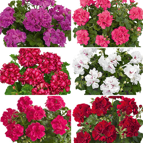 Trailing Geraniums are must-have summer bedding plants, cascading over the edges of pots, planters and hanging baskets and filling you garden with vibrant colour. This collection of Moonflair and Sunflair varieties all have lush, dark green foliage splashed with dark burgundy and amazingly bright double flowers. Flowering from May and continuing until the first frosts of autumn, these trailing geraniums are robust and will stand up to almost any weather, putting on a fantastic display month after month. Geranium 'Moonflair Red' – bright red. Geranium 'Moonflair Dark Pink' – rich deep pink. Geranium 'Sunflair Pink' – rose pink. Geranium 'Moonflair Amethyst' – bright magenta pink with a splash of red. Geranium 'Moonflair White' – white with a touch of maroon. Geranium 'Sunflair Lillipop' – two tone pinkish red. Supplied as a collection of 12 plug plants ready to grow on or plant out once the risk of frost has passed.