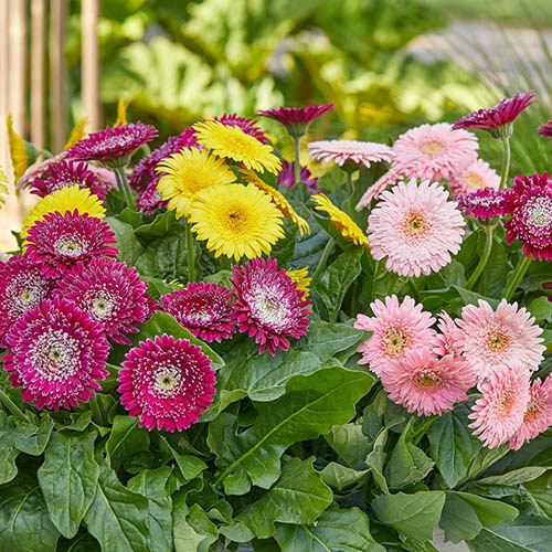 Gerberas are incredibly popular flowers and understandably common in bouquets. Perfectly formed blooms on long, straight stems in wonderfully bright colours, they're now available as herbaceous perennials. The Garvinea series are the world's first hardy Gerberas and Garvinea 'Majestic' has been bred to produce spectacular double flowers in three gorgeous colours, each one 9cm (3½in) across. You can now enjoy these amazing flowers in your own garden from May to October each year, an incredibly long flowering season that guarantees you a continuous supply of beautiful cut flowers! These Gerbers love to grow in full sun or partial shade and are hardy down to -8°C, so they'll get through a British winter, dying back underground before returning bigger, better and with even more flowers the following spring, and their immaculate looking flowers are incredibly prolific. Happy in flower borders and they look particularly good planted in groups in large pots. Supplied as 3 established plants in 7cm pots, ready to plant, reaching a height of 40cm (16in) and spread of 30cm (1ft), including: Garvinea 'Majestic Yellow' – bright lemon yellow with a hint of gold at the centre. Garvinea 'Majestic Pink' – lovely soft pink, darker in the centre. Garvinea 'Majestic Burgundy' – rich burgundy petals with white tips.