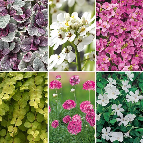 This wonderful collection of low growing, groundcover perennials is perfect for planting at the front of borders and beneath taller garden plants to completely fill your garden. Not only do they provide year-round foliage interest, and they flower too, and keep weeds at bay by gradually spreading to carpet the ground. They are all evergreen and flower in blue, pink, yellow and white during spring and summer and are recommended by the RHS as 'Plants for Pollinators', attractive bees and butterflies with their long flowering season. Simply plant them about 60 cm (2 ft) apart so that they have room to grow and give them a trim after they've finished flowering or in spring to keep their foliage dense and in shape. Supplied as 12 plug plants, ready to be potted on or planted out into your garden. You'll receive 2 each of the following: Ajuga 'Burgundy Glow' – Wonderful green and cream variegated foliage splashed with deep burgundy and spires of dainty, intense blue flowers from April until June. It will form a carpet of groundcover reaching a height of 15 cm (6 in) and spread of 90 cm (3 ft), if prefers partial shade. Armeria 'Morning Star Rose' – Narrow, grass like leaves and a profusion of bright pink flowers in May and June. Reaching a height of 15 cm (6 in) and spread of 25 cm (10 in), preferring full sun. Lysimachia 'Goldilocks' – Also known as the 'Golden Creeping Jenny', with striking, rounded golden foliage and small yellow flowers from June until October. It holds an RHS Award of Garden Merit Growing in sun or partial shade to 10 cm (4 in) height but trailing to 1 m (3 ft). Iberis 'Tahoe' – A low, spreading perennial with mounds of lance shaped, glossy dark green leaves which give rise to short, dense clusters of small, fragrant white flowers from April until June. Growing to 30 cm (1 ft) in height and spreading 60 cm (2 ft) and preferring full sun. Vinca minor 'Colada' – The white periwinkle with glossy foliage and low, spreading shoots dotted with white flowers from April until September. It will grow in sun or full shade, reaching 15 cm (6 in) in height and spreading 1 m (3 ft). Arabis 'Little Treasure' – Mounds of foliage completely smothered in bright pink flowers in April and May. Growing to 10 cm (4 in) in height and spreading 50 cm (20 in) in sun or partial shade.
