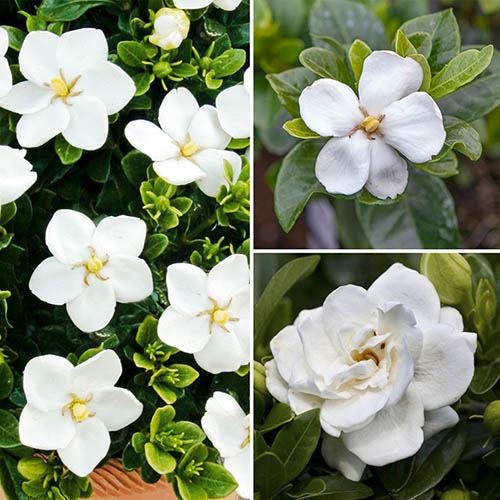 Truly hardy Gardenias with the most exquisite snow-white flowers on a backdrop of glossy green foliage – the perfect trio of shrubs to add elegance to your garden.A collection of compact shrubs ideal for gaps in borders or containers on the patio, this set includes varieties that produce that hypnotising, sweet fragrance that is widely used in perfumes. Plant around entertaining areas in the garden or along pathways and near entrances where you can fully enjoy that much sought-after scent.The classic single, star-shaped flowers of the 'Kleim's Hardy' create a simple, understated elegance, while the showier double, rose-like blooms of the 'Crown Jewel' can be cut and used in stunning vase displays. The new variety ''Sweet Heart' that we have added to this collection has larger blooms and is also hardier, blooming heavily from late spring.Flowering all summer-long, with an abundance of blooms smothering the rich green waxy foliage, these beautiful shrubs will provide you with months of fragrant displays, and they'll also keep their evergreen leaves for interest all year round. Easy to grow and maintain, simply plant in a pot or straight into the border, preferably using ericaceous compost, and it will happily grow and flourish outdoors all year round. Supplied as three plants in 9cm pots, ready to go into the large pots or a sheltered, sunny area of the garden.