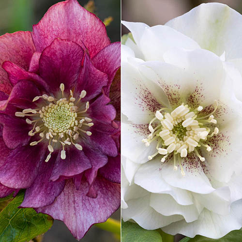 Hellebores are perfect for brightening your garden in late winter when other plants are still slumbering, and they make an ideal accompaniment to spring bulbs. A welcome sight, they are a simply stunning winter flowering plant that will give a real woodland feel to your garden during the winter and spring months. In this collection: Hellebore Double Ellen Red – This gorgeous perennial produces the most luscious, reddish-purple blooms that have lovely pale creamy yellow centres that add a much-needed splash of colour to the winter garden. Hellebore Double Ellen White – while most of your plants are still sleeping, Double Ellen White will produce the most immaculate, pure white double flowers that have with pale green-yellow centres add welcome and delicate interest to the winter garden. These hardy perennials will flower from February to April filling your winter garden with some much-needed colour, with each flower rising up above the leathery evergreen foliage for a perfect contrast. Each flower produced measures approximately 3-5cm across, and although they may look dainty, they're incredibly tough, whatever the weather! Simple to grow, hellebores will slowly establish into small clumps, thriving in lower light and shady spots. They can be grown in pots too, provided they do not dry out in summer. Supplied as 4 x established plants, 2 of each variety, in 9cm pots, ready for you to plant out.