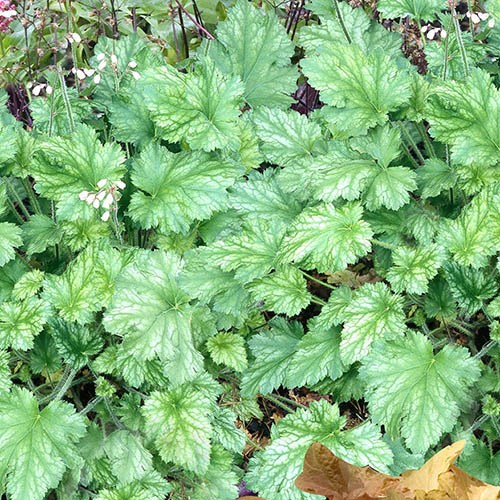 Heucheras, also known as Coral Bells, are amazing perennial plants, famed for their spectacular foliage in a huge range of colours with wonderful leaf shapes forming low growing evergreen or semi-evergreen mounds. 'Dale's Strain' is perfect if you're looking to add year-round colour to your garden. It has serrated, wavy foliage in a beautiful and silvery mid green colour that are often flushed with purple details. In late spring and early summer, 'Dale's Strain' produces panicles for small bell-shaped flowers in a gorgeous blush pink that contrasts effortlessly against the gorgeous green foliage. They are also attractive to wildlife such as bees and hummingbirds. It will thrive in pots and looks great planted towards the front of mixed borders, especially when several different varieties are planted together, creating a carpet of colourful, evergreen groundcover. These adaptable plants are happy in sun or partial shade and aren't too fussy about soil conditions if it isn't heavy and waterlogged as that will cause the crown to rot. Usually evergreen, severe winters may cause leaf loss, but they'll regrow the following spring. Supplied as 3 x established plants in 9cm pots, ready to pot on or plant out. Growing to a height and spread of 40cm (16in) x 35cm (14in).