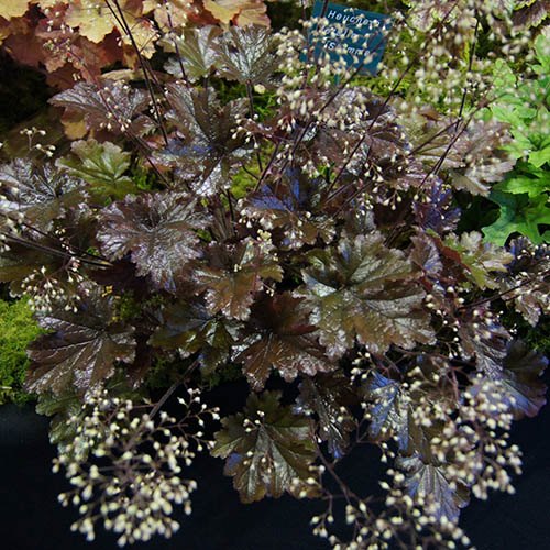 Heucheras, also known as Coral Bells, are amazing perennial plants, famed for their spectacular foliage in a huge range of colours with wonderful leaf shapes forming low growing evergreen or semi-evergreen mounds. From the 'Fox' series of Heucheras, bred by Richard and Vicky Fox at their Jubilee Cottage Nursery in Cheshire where they hold the National Collection which currently exceeds 450 varieties, 'Metallic Shimmer' is perfect if you're looking for a darker coloured Heuchera. With its serrated, wavy leaves in shades of warm chocolate, burgundy and grey-green, all having a stunning bronze, metallic shimmer and contrasting dark pink undersides. Masses of frothy, creamy white flowers emerge in summer on tall, deep purple stems that are a magnet for bees, butterflies and other pollinators and they make great cut flowers too, looking similar to Gypsophila in flower arrangements. Heuchera 'Metallic Shimmer' will thrive in pots and looks great planted towards the front of mixed borders, especially when several different varieties are planted together, creating a carpet of colourful, evergreen groundcover. These adaptable plants are happy in sun or partial shade and aren't too fussy about soil conditions, as long as it isn't heavy and waterlogged as that will cause the crown to rot. Usually evergreen, severe winters may cause leaf loss, but they'll regrow the following spring. Fully deserving its coveted RHS Award of Garden Merit, you can be sure that this is a proven garden performer, guaranteed to be suitable for UK gardeners at every level of experience. You can therefore plant this in the garden with confidence, for stunning displays for many years to come. Supplied as an established plant in a 9cm pot, ready to plant, reaching a height of 30cm (1ft) and spread of 40cm (16in).