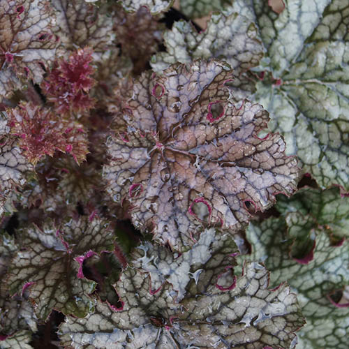 Heucheras, also known as Coral Bells, are amazing perennial plants, famed for their spectacular foliage in a huge range of colours with wonderful leaf shapes forming low growing evergreen or semi-evergreen mounds. From the 'Fox' series of Heucheras, bred by Richard and Vicky Fox at their Jubilee Cottage Nursery in Cheshire where they hold the National Collection which currently exceeds 450 varieties, 'Silver Celebration' has been bred to celebrate the 25th anniversary of the nursery. This is an incredibly attractive Heuchera, with unusually large and deeply ruffled, dark veined metallic silver leaves that have vibrant purple undersides. During the summer, a profusion of bell-shaped white flowers appear on long, upright stems above the foliage. The flowers are larger than those of most Heucheras and attract a host of pollinating insects. They're also ideal for cutting for delicate indoor displays. A handsome plant with colouring unlike any other, 'Silver Celebration' will make an impressive specimen growing in a large patio pot, or grow it in borders with other Heuchera varieties so that their foliage colours can compliment each other. These adaptable plants are happy in sun or partial shade and aren't too fussy about soil conditions, as long as it isn't heavy and waterlogged as that will cause the crown to rot. Usually evergreen, severe winters may cause leaf loss, but they'll regrow the following spring. Fully deserving its coveted RHS Award of Garden Merit, you can be sure that this is a proven garden performer, guaranteed to be suitable for UK gardeners at every level of experience. You can therefore plant this in the garden with confidence, for stunning displays for many years to come. Supplied as an established plant in a 9cm pot, ready to plant, reaching a height of 35cm (14in) and spread of 45cm (18in).
