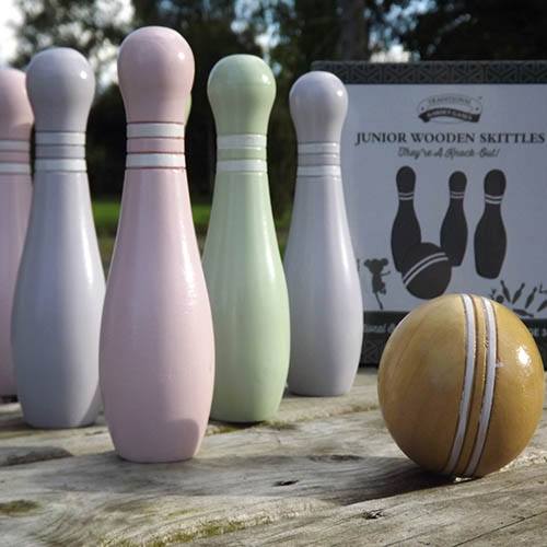 Children and adults can together practise their bowling skills with our NEW and delightful pastel coloured Junior Wooden Skittles Set. Carefully roll the ball and hopefully someone will get a lucky strike! Suitable to play both indoors and outside, at home, on holiday or during social gatherings with family and friends. Getting married? Our pastel Junior Wooden Skittles are the perfect game to keep guests of all ages entertained and provide fun photo opportunities. This game can improve both hand/eye coordination and gross motor skills. Contents: 6 Wooden Skittles in pastel colours (17cm high) 1 Wooden ball (7cm diameter) Full instructions