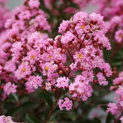 Lagerstroemia indica, or Crepe Myrtles are spectacular deciduous flowering shrubs often seen on the continent. These sun loving beauties can also be grown in the UK, looking wonderfully exotic when in full flower. Some Crepe Myrtles can grow to 8m (25ft) tall, but 'Eveline' is much more compact and is unlikely to grow far beyond 2m (6½ft), the perfect size for a garden border or a large pot, making an incredibly impressive specimen. If you admire the Bougainvillea seen all over the Mediterranean and want something similar that will grow at home, then Crepe Myrtle is ideal. 'Eveline' flowers abundantly from June to September with masses of large, frilly edged, bright pastel pink flowers carried on panicles up to 20cm long bursting open from round pink and green buds, attracting bees and butterflies into your garden to feast on the fabulous blooms. As well as its amazing flower display, Lagerstroemia indica has even more to give. As it matures, it develops beautiful peeling grey and brown bark. Not only that, but the young foliage is tinged with rich bronzy red before maturing to dark green, with large 8cm long leaves, and in autumn it turns to vibrant gold, red and orange before falling. Hardy to below -5°C, it'll need some protection during the coldest winters, and it can be grown in a large pot to make sheltering it easier. Fully deserving its coveted RHS Award of Garden Merit, you can be sure that this is a proven garden performer, guaranteed to be suitable for UK gardeners at every level of experience. You can therefore plant this in the garden with confidence, for a stunning display for many years to come. Supplied as an established plant in a 3L pot, ready to plant. Growing to a height and spread of 2m (6½ft).