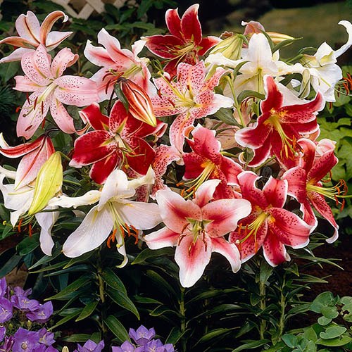This stunning lily collection contains: 25 Mixed Asiatic LiliesThese bright, upward facing beauties bloom earlier than most other lilies thereby extending the season. They have strong stems to support the many blooms you get per bulb and make perfect pot or border plants, plus cut fl owers too. Guaranteed to flower, very hardy! Height 45-60cm (18-24") 25 Mixed Oriental LiliesOriental lilies are highly fragrant and fl ower year after year in beds, borders or patio pots. Each 'double nose' bulb should give 2 flower stems, each carrying 3-5 fragrant fl orets! Includes the ever-popular 'Stargazer'. Height 1.2m (4ft).