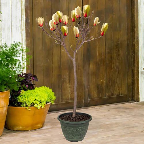 A spectacular standard plant for a border or even a large patio container, Magnolia denudata 'Sunrise' is a striking shrub that has a neat, compact shape, making it perfect for growing in small gardens. A recently introduced variety, this Compact Chinese Magnolia is truly magnificent when covered in its opulent and fragrant blossoms in spring. You will be delighted when 'Sunrise' comes into its own, producing masses of unique, almost bicolour, 2-tone creamy goblet shaped flowers with a distinctive claret-red flame emerging from the base of each bloom. This tulip tree is really a sight to behold – just be prepared for everyone to ask you what it is! Easy to grow, this fully winter-hardy compact standard Magnolia makes an eye-catching focal point in smaller spaces, and its super-easy to look after – there's no fussy pruning or shaping, just keep it well-watered and undisturbed. Supplied as an established plant in a 3L pot, approx. 1.1-1.2M tall, ready to plant. Your magnolia can be kept compact with regular spring pruning to limit its height.