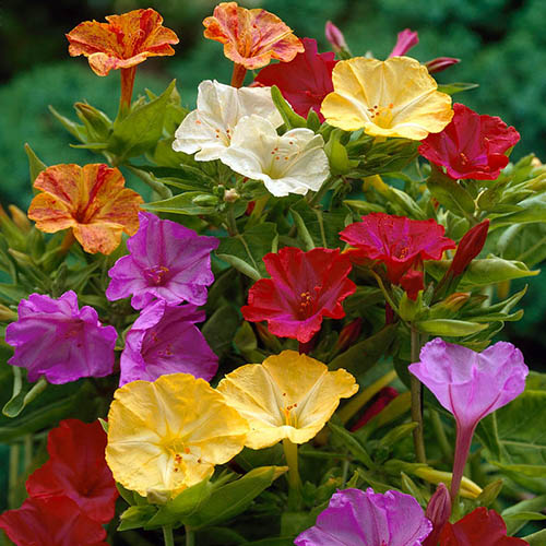 The unusual and immensely pretty Mirabilis jalapa opens its gorgeous flowers in mid-afternoon on sunny days in the height of summer – only to close them again at night, hence one of its common names 'The Four O'Clock Plant'. Incredibly, each plant produces its flowers in a mix of colours – from deep-magenta, to pure-white, bicolours, and even bright-yellow – it's no wonder its called the 'Marvel of Peru'! Plant this beauty in beds and borders, and it will form a neat, bushy shrub that will grow to about 1m (3ft) tall. Alternatively, plant them in deep pots, like carrots would grow (you will see what we mean when you get them!)