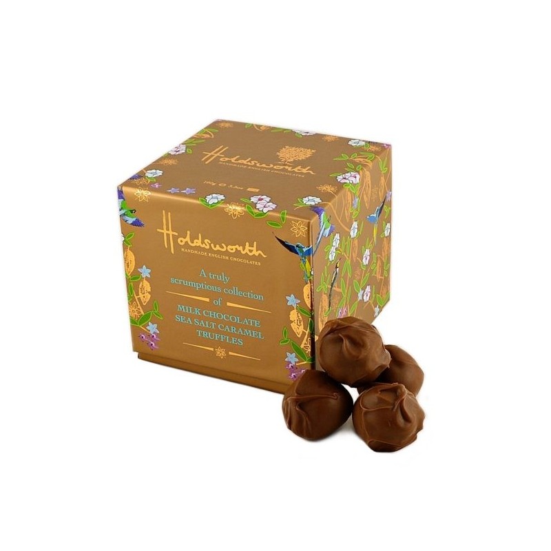 Part of the Truly Scrumptious collection, these stunning sea salt caramel truffles are enrobed in the finest Milk Chocolate.Beautifully presented in a hand-finished foil embossed cube with unique Theobroma and Birds print on gold.Ingredients: Caramel 52% (Glucose Syrup, Sweetened Condensed Skimmed Milk, Sugar, Water, Cocoa Butter, Modified Starch, Thickener: Agar, Flavours, Emulsifier: E471-Sunflower Lecithin, Salt, Acidity Regulator: Citric Acid, Preservative: Potassium Sorbate), Milk Chocolate 48% (Sugar, Cocoa Butter, Whole Milk Powder, Cocoa Mass, Emulsifier: Soya Lecithin, Natural Vanilla), Salt Flakes 0.4%.For allergens, including cereals containing gluten, see ingredients in bold. May contain nuts and peanuts.
