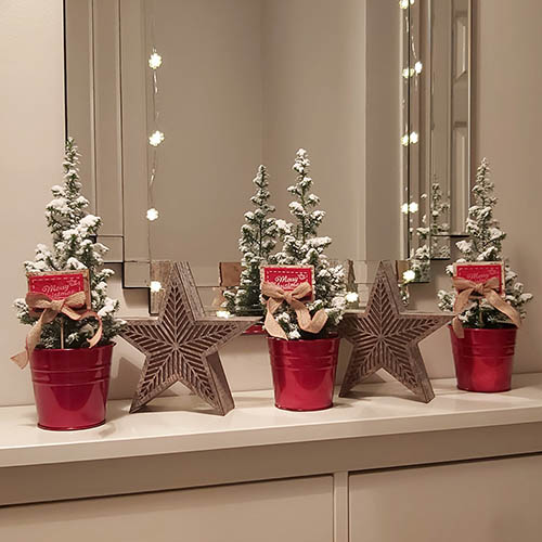 Get into the festive mood with these wonderful, decorated mini-Christmas Chamaecyparis Thyoides or as they aremore commonly known 'Top Point'. They are so cute! At just 20-25cm tall, they are perfect for instant windowsill or tabletop displays, or perhaps for an easy to look after tree in the children's bedrooms. Each pot grown real conifer is given a dusting of magical fake snow, for a real traditional festive feel. Not only that, but they are also supplied ready to display in an attractive red zinc pot, and complete with miniature decorations! Just unpack, and they are ready to go. The perfect living decoration – if kept watered indoors this Christmas, they can be planted outside, and will grow slowly over many years – the snow will of course wash off in the rain, but perhaps if planted in a bigger pot, can be brought inside each year and re-decorated. The perfect and easy to look after living tree gift or decoration this year. Note – exact decoration may vary.
