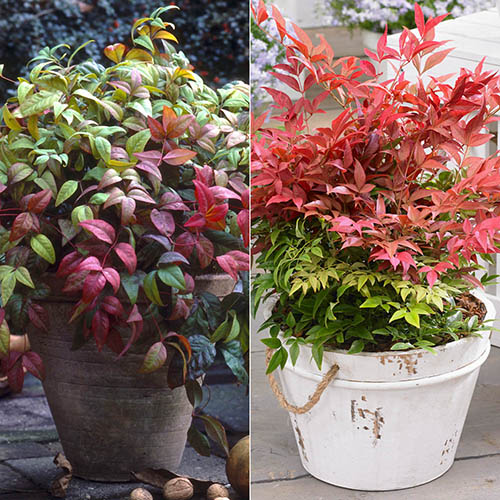 Nandinas, also known as Heavenly or Sacred Bamboo, are amongst the best shrubs you can grow for adding bright flashes of dazzling colour to your borders or patio pots. They are invaluable during the winter when there's little colour around. Not unlike a colourful version of our own native holly, Nandina has a bushy upright habit, with toothpick-straight stems making it an excellent candidate for containers. As they are evergreen, they will retain their foliage throughout the year and the colours change as temperatures dip, taking on deeper and more saturated hues. In this collection your will receive: Nandina Domestica 'Firepower' – With its bamboo-like habit, 'Firepower' is a beautiful and compact shrub, producing several upright stems from a tight clump of foliage which is mid-green during spring and summer. Tinged with red and purple on new shoots, it also produces clusters of small white flowers in summer, that become shiny red berries in autumn, which is the time that the real show begins as the leaves change colour. The evergreen leaves become a spectacular bonfire orange and red, for stunning autumn colour which transforms to deeper maroon as it gets colder and the berries change to brighter and brighter red, so the whole plant is a frenzy of colour throughout winter. Grows to 50cm. Nandina Domestica 'Obsessed' – This particular variety has amazing, variegated leaves which give off a sultry pink glow. A true multi-season feature plant, in spring new leaves emerge flushed pink, green and cream, then in summer, small creamy-white flowers are followed by green berries, before the leaves develop more colour and the berries turn sealing-wax red – just superb! Grows to 120cm. They are very easy to grow, they look great when planted in a pot, so you can move it near the door to lift your spirits on dark days, or equally at home in the soil in a mixed border planting. In Japan, they are traditionally grown near a door, so if you awake from a nightmare, you can tell your Nandina about your dream so that it cannot harm you! Supplied as 2 x established plants in 12cm pots, ready to plant out.