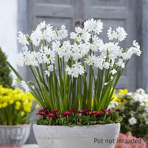 Paperwhites, Narcissus papyraceus, are natives of northern Africa and southern Europe where they grow wild in the stony, free draining soil. The tiny pure white flowers may only be 2 cm across but there could well be 15 of them on each stem, each one carrying an incredibly sweet, heady fragrance. What's more, there will often be two stems per bulb, so the blooms really will be abundant. In the UK climate they are best grown indoors and if planted in November they will be flowering throughout Christmas, just 6 to 8 weeks later if the temperature is around 21°C. They take longer if they're cooler. Plant them close together for maximum impact and choose a fairly deep pot, as they have deep roots. If planting outdoors, ensure good drainage in a sheltered spot to avoid frost pockets. Supplied as 5 bulbs, ready to plant in autumn and growing to a height of 50cm (20 in) and width of 10 cm (4 in).