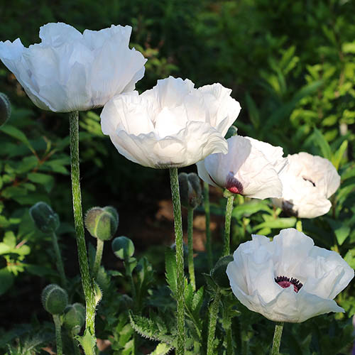 An iconic, cottage garden flower, but with origins far away, the classic large flowered oriental poppy with its characteristic black blotch in the centre is followed by statuesque seed heads that add longer season interest. 'Checkers' is a beautiful variety of Oriental Poppy, with their soft white, silk like petals that have a contrasting black cross at the base. Standing tall on top of their sturdy stems, the thick foliage has a bristly texture to it that provides a stunning backdrop to these gorgeous blooms. A real low maintenance, easy plant to grow, these poppies make a bold statement when planted as a group or as individual specimens. 'Checkers' is a very tough, hardy, and robust perennial, the Oriental Poppy dies back underground each winter, and emerges bigger and better for years to come. Supplied as 3 x established plants in 9cm pots, ready to pot on or plant out.