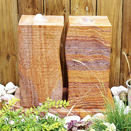An amazing style of heavyweight water feature, constructed using natural stone. Comes with LED light effect for a fantastic feature at night time, complete with a pump, plastic base/reservoir and Pipe. Built from natural materials. Compliments any garden perfectly. Size: 50cm H x 53cm W x 30cm D. Weight:155kg Electric power point required. Due to the weight of these solid stone sculptures, we recommend placing them on a firm and level surface such as concrete or paving slabs. This product is supplied and delivered by one of our carefully selected retail partners. Please provide an email address or telephone number at the point of ordering so that delivery can be arranged. For delivery purposes, please note the following supplier stipulations: In accordance with our conditions of sale, it is important to note that our delivery system requires a hard flat area to receive our product.Delivery is to kerbside only If we are unable to make a delivery due to the point of off-loading not meeting the criteria then return charges will apply. If you wish to return your item you will be charged the return delivery charge and will be advised of this cost. If you prefer you may return the goods to the supplier at your own cost. The following postcodes carry an additional delivery surcharge: AB, DD, DG, EH, EX, FK, G, KA, KY, LD, LL15+, ML, PA1-19, PH1-18, PL, SA, SY10+, TD, TR: £12.00IV1-41, KW1-14, PA20-34, PH19-41: £42BT, GY, HS, IE, IM, JE, KW15-17, PA20, PH42-44, ZE: £90Eire and Other Offshore:POA Please NoteNatural Sandstone products have an orange, purple and silvery grey appearance which due to differing geological conditions will vary. Over time with the effects of natural weathering colour variation can occur.Certain variables such as weathering or site location can cause discolouration to individual pieces, these will generally dissipate over time and will not affect performance of the product. Due to mineral content oxidisation in natural stone, some additional marks/patches may appear.All products may require cleaning as algae and organic growth is possible under particular environmental conditions.The supplier advises careful handling of natural sandstone when installing and suggest sealing the item with an approved sealant, testing a small patch first. This will minimise staining and scratches as well as reducing the effects of weathering.