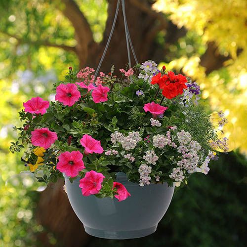 Pair of 'Designer Mix' Baskets – A stunning selection of plants in shades of pink, blue and white. Why not treat yourself to a pair of these gorgeous pre-planted baskets? They come ready planted including the basket, compost and plants and will arrive requiring no additional work by you other than occasional watering and feeding! Each basket will be planted by our expert growers and will contain a terrific hand-picked selection of healthy, top quality plants. They will be delivered in specially developed packaging to ensure they arrive in perfect, nursery-fresh condition when you get them, just hang them up and water them every couple of days to ensure a summer long display of beautiful blooms! The baskets themselves will be re-useable for many seasons. 'Designer Mix' is supplied ready planted in a pair of 27cm durable, green plastic hanging baskets, each with 6 plants, 1 each of the following: Brachyscome Mini Mauve DelightDiascia Little DreamerGeranium Fantasia ScarletNemesia Easter BonnetPetunia Fanfare Hot RoseVerbena Aztec Magic PurpleWhite