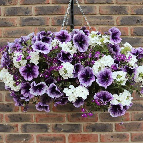 Our pre-planted basket is guaranteed to give you fabulous results, we've done all the work for you – just hang it up, water it and let it do its thing. Quick and easy, this is the perfect solution for gardeners who want perfect displays but don't know where to start, or for those who are behind with their plans. 'Parma Violet' is a cool and calming blend of trailing lobelia, trailing verbena and surfinia petunia, guaranteed to grow happily together. Pre-planted in a single berry purple-coloured basket, you'll be rewarded with gorgeous colour through the summer. Our ready-made basket is the result of trials to find the perfect partners to grow together and perform consistently. Perfectly matched to give you outstanding results in as little as 6 weeks – plus you'll have the basket to use again next year! In this collection you will receive: 1 x Pegasus purple vein – beautiful lilac blooms with dark purple centres and veins. 2 x Verbena Samira white – elegant clusters of small white flowers. 2 x Lobelia Laura Red – simply stunning and unique light pink blooms. Our hanging basket comes straight to you, ready planted with our top quality, UK-grown plants go with no work required! Plants are supplied ready planted into a single 25cm durable berry purple plastic hanging basket.