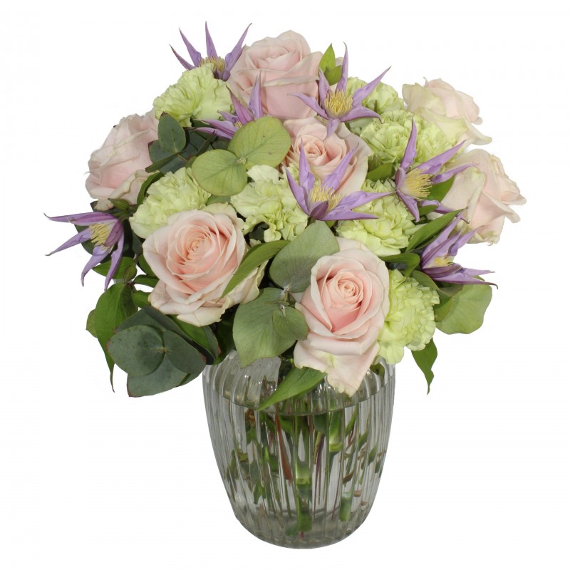 Whatever the season, this bouquet is just what the doctor ordered. Pastel pink roses, viburnum, clematis and green carnations are a perfect match – is it any wonder this is one of our most popular bouquets from Christmas to Fireworks Night