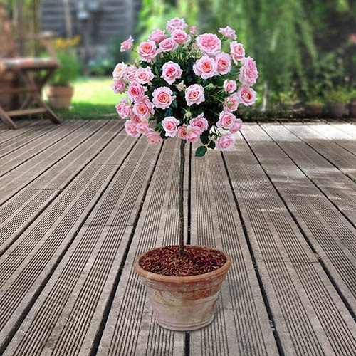 Rosa 'Graciously Pink' is a repeat-flowering patio rose, which becomes smothered in clusters of mid-pink blooms through summer and into autumn. A beautiful, compact rose that will look magnificent displayed on your patio or outside your front door, this half standard has a long, slender stem, topped with a head that bursts into vibrant colour with clusters of fragrant flowers. The double flowers are lightly perfumed, which makes Graciously Pink a superb addition to your garden and as a more compact rose, it's ideal in containers so you don't even need a garden to benefit from its scent. A patio rose is a miniature floribunda rose and as such guarantees you a fabulous show of multiple blooms. They easy to grow and don't require much maintenance, being smaller than the average rosebush, so you can plant in the garden with confidence, for stunning displays for many years to come. Perfect to use as groundcover when grouped together, Patio Roses are growing in popularity and are more and more being used to reduce erosion on slopes – so they are the perfect rose for ecologically minded gardeners. If you think that roses are not for you, then why not consider 'Graciously Pink' as a low hedge – with its lovely, glossy green leaves complimenting its blooms, it really is a great garden all-rounder and will give you vases of cut flowers for your home too! Supplied as an established plant in a 5L pot, ready for immediate planting.