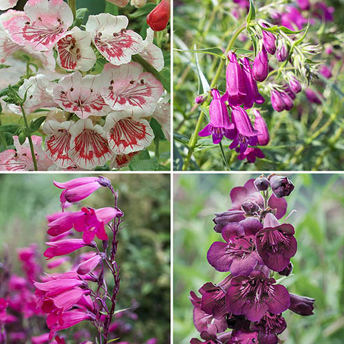 Penstemons are a classic cottage garden perennial that has enchanting bell-shaped flowers in a range of bright colours. We've brought together four varieties in shades of pink and purple that all complement each other perfectly. Grow them in a sunny or slightly shaded spot and they'll flower in upright spires for month after month from June until the autumn. Easy to grow and winter hardy, you're guaranteed masses of spectacular flowers that are also great for cutting for indoor arrangements. Recommended by the RHS as a 'Plant for Pollinators' the flowers are produced through the spring and summer and are a favourite with butterflies and bees. Superb grown in beds and borders, Penstemons prefer well-drained soil and forms large clumps over time, rewarding you with more flowers year on year. Looking after them is easy too, occasionally deadhead fading blooms to prolong the display and cover plants with a dry mulch of compost in late autumn to protect the roots from frost. 'Garnet' – Gorgeous deep pinky-red flowers. Holder of the RHS Award of Garden Merit. 'Sour Grapes' – Amazing purple flowers splashed with blue. Another holder of the RHS Award of Garden Merit. 'Ice Cream Blackberry' – Rich dark purple flowers. 'Strawberries and Cream' – Lovely pale pink flowers with red stripes. Supplied as 4 x established plants in 9cm pots, ready to plant out.