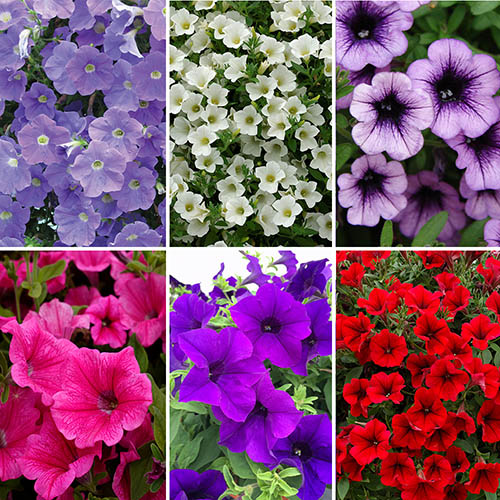 Create stunning floral displays all summer long with this collection of 'Surfinia' Petunias. Guaranteed to impress anyone that see them, these blooms are perfect for planting in hanging baskets, containers, and window boxes, thanks to their trailing habit. Cascading over the edges of their home, they can reach anything between 50cm to 120cm long. Producing gorgeous blooms in beautiful shades of pinks, purples, blues and white from as early as June and lasting all the way through to October. On top of its flowering ability, it is also vigorous, low maintenance, disease, and weather resistant. It is because of all these positive attributes you see it planted in so many professional displays! In this collection you will receive – 1 x Petubia Surfinia 'Purple Vein' – Pale violet blooms with dark purple veins and dense green foliage. 1 x Petubia Surfinia 'Hot Pink' – Trailing 'Hot Pink' trumpet shaped flowers with dark pink vein details. 1 x Petubia Surfinia 'Purple' – Large deep purple blooms with dark centres and gorgeous green foliage. 1 x Petubia Surfinia 'Snow' - A stunning display of trailing white flowers and beautiful foliage. 1 x Petubia Surfinia 'Blue' – Cascades of deep blue blooms with dark centres, perfect for hanging baskets. 1 x Petubia Surfinia 'Dark Red' – Dramatic deep red flowers that last from June to October. All six of these gorgeous trailing Surfinia are perfect for planting alone but will really come to life if you mix the colours together. Supplied as a selection of 6 established plants in 9cm pots, ready to plant.
