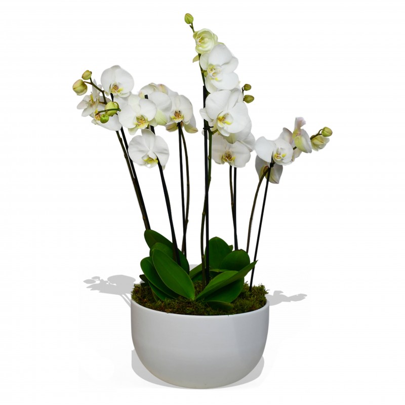 Pure white orchids in a white ceramic bowl. A classic design, a luxurious option for your home. Make a purchase today and enjoy same day delivery as standard.