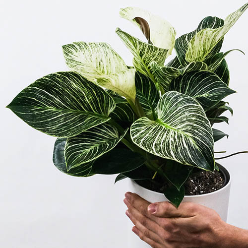 A stunning houseplant, Philodendron 'White Wave' will make a wonderful addition to your collection. Its architectural look will enhance your home and give it a contemporary feel. The large leaves unravel to a lush dark green colour, and as they mature contrasting narrow white stripes appear making this a fabulous looking plant and a real focal point, bringing year-round interest to any room. Very easy to care for and maintain, 'White Wave' forms a neat bush, 90cm (3ft) in height and width. Gardeners have known for years that many houseplants are great plants for the home, helping you to get a good, restful night's sleep because of their ability to keep the air inside your home clean, removing toxins such as formaldehyde and benzene, and giving out valuable oxygen at night. Supplied as a potted plant in a 14cm nursery and growing to a height and spread of 90cm (3ft).