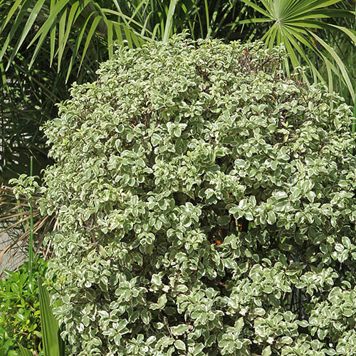 Grown for its attractive, variegated dense foliage, the leaves of Pittosporum 'Silver Ball' are carried on striking dark stems. One of the hardiest pittosporums, it's perfect in a gravel garden or container to which its compact shape is ideally suited. A compact, rounded evergreen with creamy edged grey-green leaves will form a neat mound with very little effort on your part. 'Silver Ball' lends itself well to topiary and its natural shape makes it an interesting alternative to Box balls. During May and June small, honey scented bell shaped darp purple flowers appear, contrasting well against the pale shades of the foliage. Supplied as an established plant in a 9cm pot ready for immediate planting, 'Silver Ball' will reach approx. 1m in 10 years.