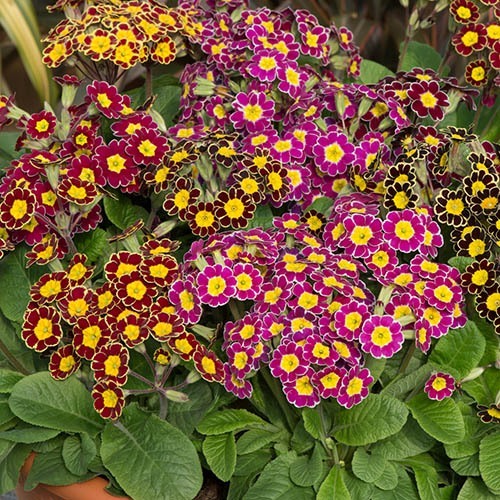 'Victoriana' are gorgeous, old fashioned style Primulas that feature a wonderful lacing effect outlining their flower petals. This mixture features flowers with golden yellow centres in deep mahogany with gold lacing, whilst the bright magenta and rich red varieties have silvery lacing. While they have the same number of petals as any other primula, their unique patterning gives the effect that they have twice as many, and their delightful blooms add a sophisticated contrast when planted with other primulas. The flowers are carried on robust, upright stems and can easily number 10-15 per stem. Primulas are woodland plants, so they love shady areas and look wonderful growing underneath shrubs and trees, where they really brighten up the garden before the summer flowering plants take over. Reliable perennials that will naturalise easily, they form tight clumps over several years, and are an absolute delight when they emerge each spring. Occasionally they will flower for a second time in late summer or autumn. Supplied as 20 garden ready plants, ready to plant in your garden and growing to a height and spread of 20 cm (8 in).