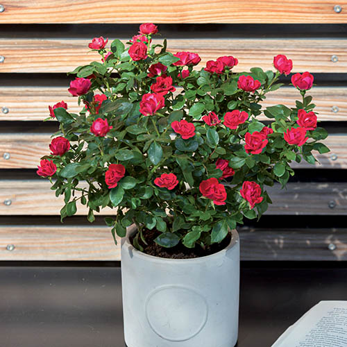 'Zepeti' is a triumph of rose breeding from the House of Meilland in France, created to be incredibly resilient as well as beautiful. This miniature rose has lush, dark green glossy foliage and dazzling, bright red semi-double flowers that are produced in clusters. The fragrant flowers are small at 5 cm (2 in) across but are intensely coloured, and 'Zepeti' is very free flowering, producing abundant blooms continuously from May until October. 'Zepeti' is exceptionally resistant to fungal diseases such as powdery mildew and black spot and is also extremely tolerant of both summer heat and winter frosts. This makes it an incredibly robust rose that will always perform well. As a miniature rose, it is very well suited to growing in a pot, where it makes a stunning focal point, particularly because its leaves and flowers always look so immaculate. Planted in the garden, it also looks good growing amongst small shrubs and perennials. Supplied as a freshly potted, professional quality plant in a 3L pot, growing to a height and spread of 60 cm (2 ft).